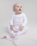 Long sleeve sleepsuit, Organic cotton fabric, YKK popper fastening on shoulder and around leg opening, Set in sleeves, Binding around neck and self fabric cuff on sleeve, Size tab only